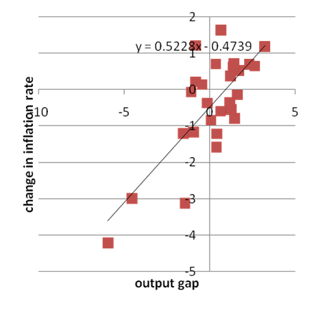 I thought it might be useful to present a bit of evidence behind that concern. The figure above plots an estimate of the output gap — the difference between actual and potential GDP, as a percentage of potential — and the change in the inflation rate. Both series are taken from the IMF WEO database, for convenience, and use data from 1980-2007.